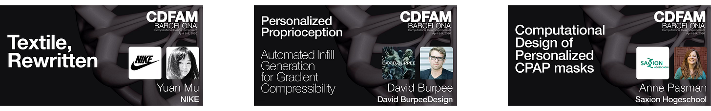 Not all of the program sits at the deep engineering end. Yuan Mu from Nike will address computational fabrication applied to textile design, embedding athlete motion data into parametric workflows for footwear and apparel. Palace will discuss colour perception within a computational design context. Gravity Sketch will address spatial interaction and spatial computing as a design interface. David Burpee will present the Sequence Dynamic Insole Generator - an automated Houdini-based toolchain that generates variable density infill toolpaths directly from biomechanics data, with custom pathfinding algorithms embedding print constraints into G-code to produce gradient compressibility profiles tuned to individual kinematics. Saxion University of Applied Sciences will present complementary work on personalized CPAP mask design, using 3D scan data, postural analysis, and pressure mapping to drive computational mask generation and silicone 3D printing at regional hospital scale.