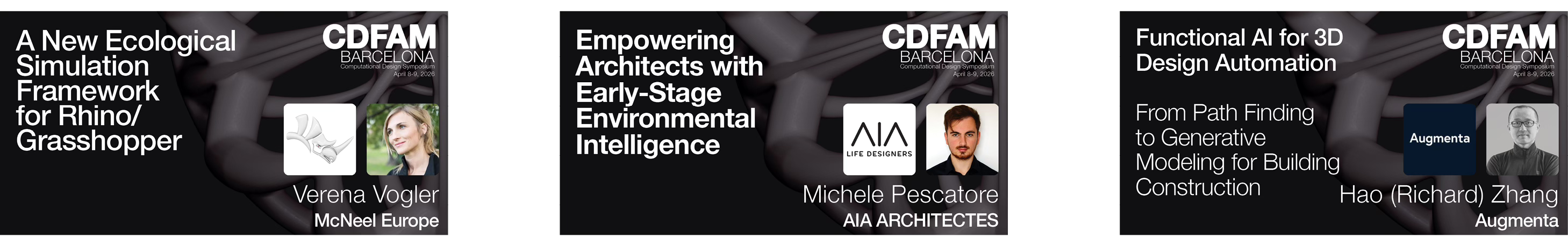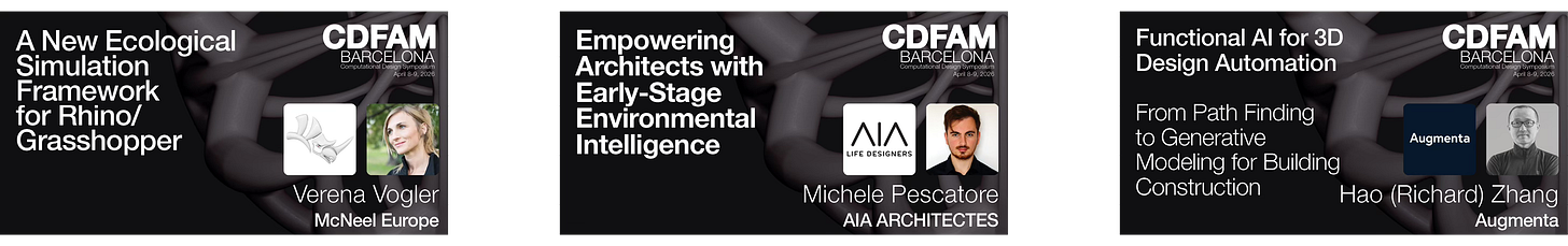 Augmenta will present their work on functional AI for 3D design automation in the built environment - from pathfinding to generative modeling for building construction, including the first buildings with electrical systems delivered by AI-powered generative design. McNeel Europe’s Verena Vogler will introduce Rhino.Ecologic, a new ecological simulation framework for Rhino and Grasshopper that integrates location- and time-specific species distribution, biomass, and biodiversity modeling into computational design workflows. AiA Life Designers will address environmental performance simulation at the earliest stages of architectural design, where decisions carry the greatest impact but feedback is typically absent. Claudia Valverde from the University of Stuttgart’s IntCDC will present research on architected porous structures designed around real-world climatic and ecological data, with working prototypes installed on actual buildings and monitored under outdoor conditions.