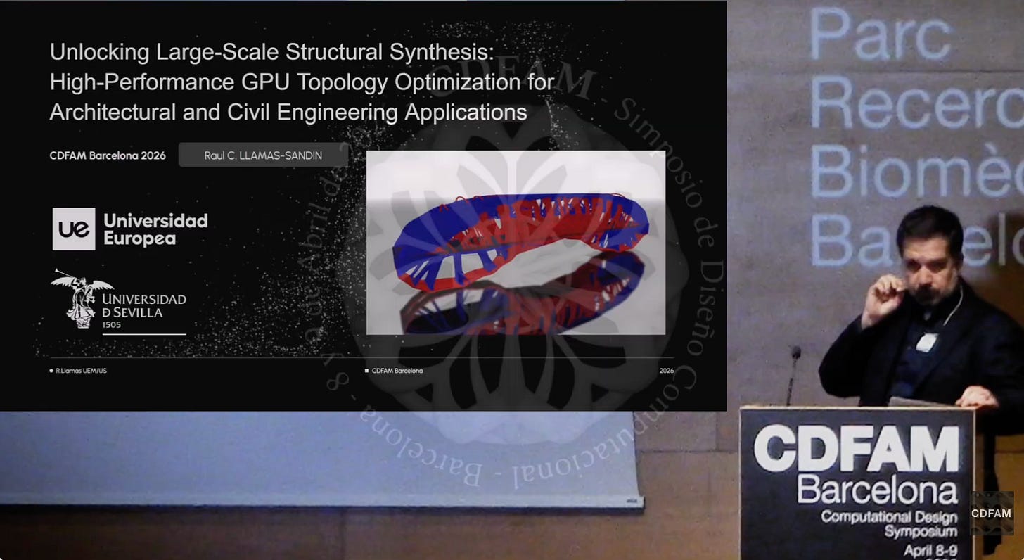 In this episode recorded at CDFAM Barcelona 2026, Raul C. Llamas-Sandin presents a GPU-accelerated solver that addresses this directly, reducing solve times for large-scale problems to minutes on a workstation. He covers the key technical features that make it relevant for the built environment: asymmetric tension-compression stress constraints, thermoelastic analysis, and geometric constraint enforcement for fixed architectural elements and fenestration.